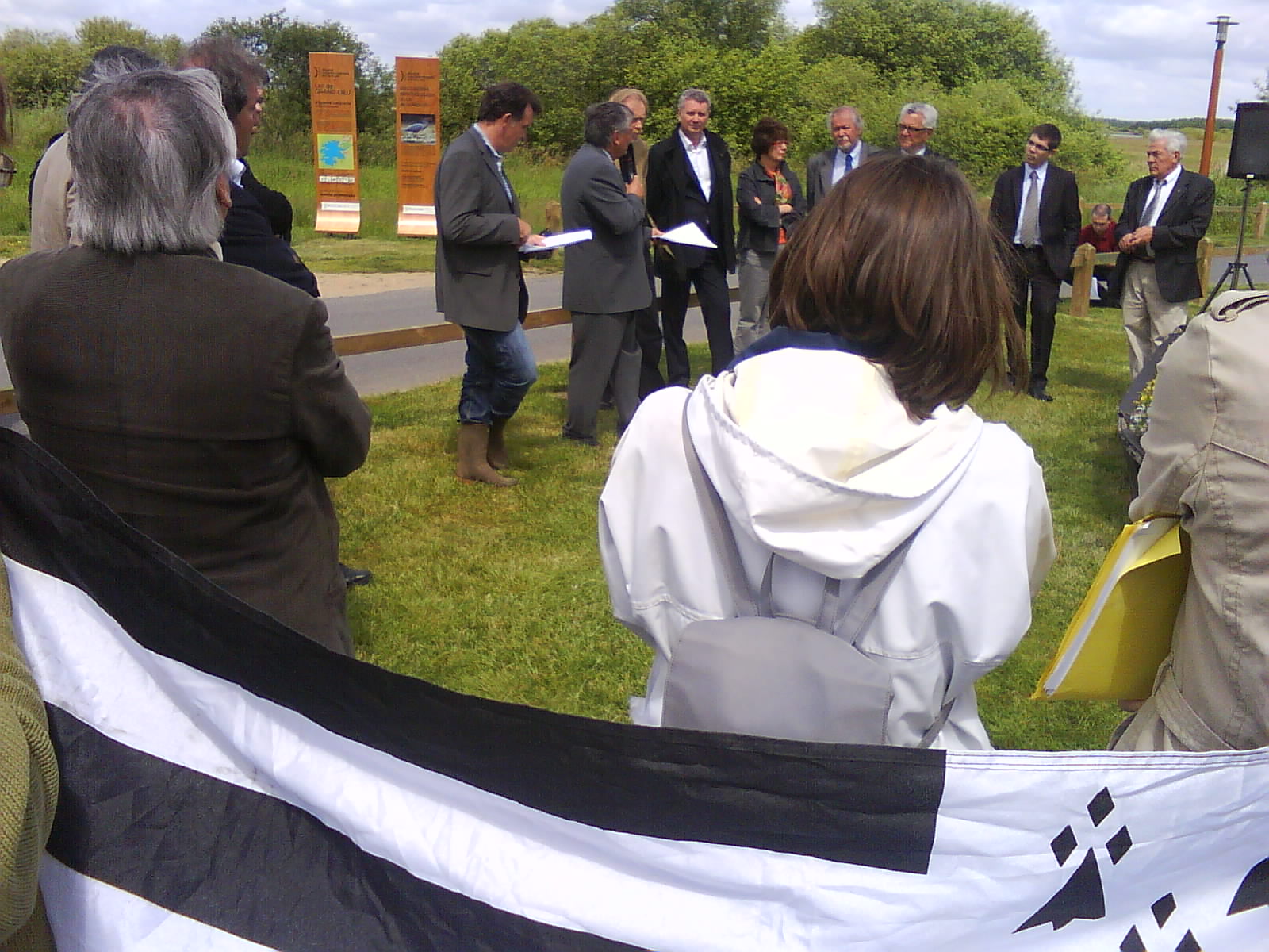 Pour cela M. Auxiette s’est vu rappeler l’appartenance du Pays de Retz à la Bretagne puisqu’un gwenn-ha-du a été déployé lors de sa prise de parole. Il s’agit de rappeler une évidence qui est niée par la région Pays de la Loire, qui préfère construire son projet « ligérien » contre ses administrés plutôt que de leur laisser démocratiquement le choix de la région administrative à laquelle ils souhaitent appartenir.
