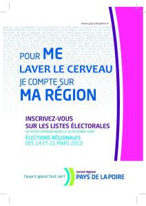 Si vous habitez le Pays Nantais vous avez sûrement vu la nouvelle campagne d’affichage financée par les « Pays de la Loire » concernant les élections régionales à venir. Sur l’affiche on peut lire des slogans tels que « pour ma formation je compte sur ma région ». Des slogans louant l’action de la région en matière de formation, d’environnement, de transports de financement des lycées, de culture, etc. En plus petit dans la partie inférieure des affiches est inscrit : « inscrivez-vous sur les listes électorales », et tout cela aux couleurs de la région.