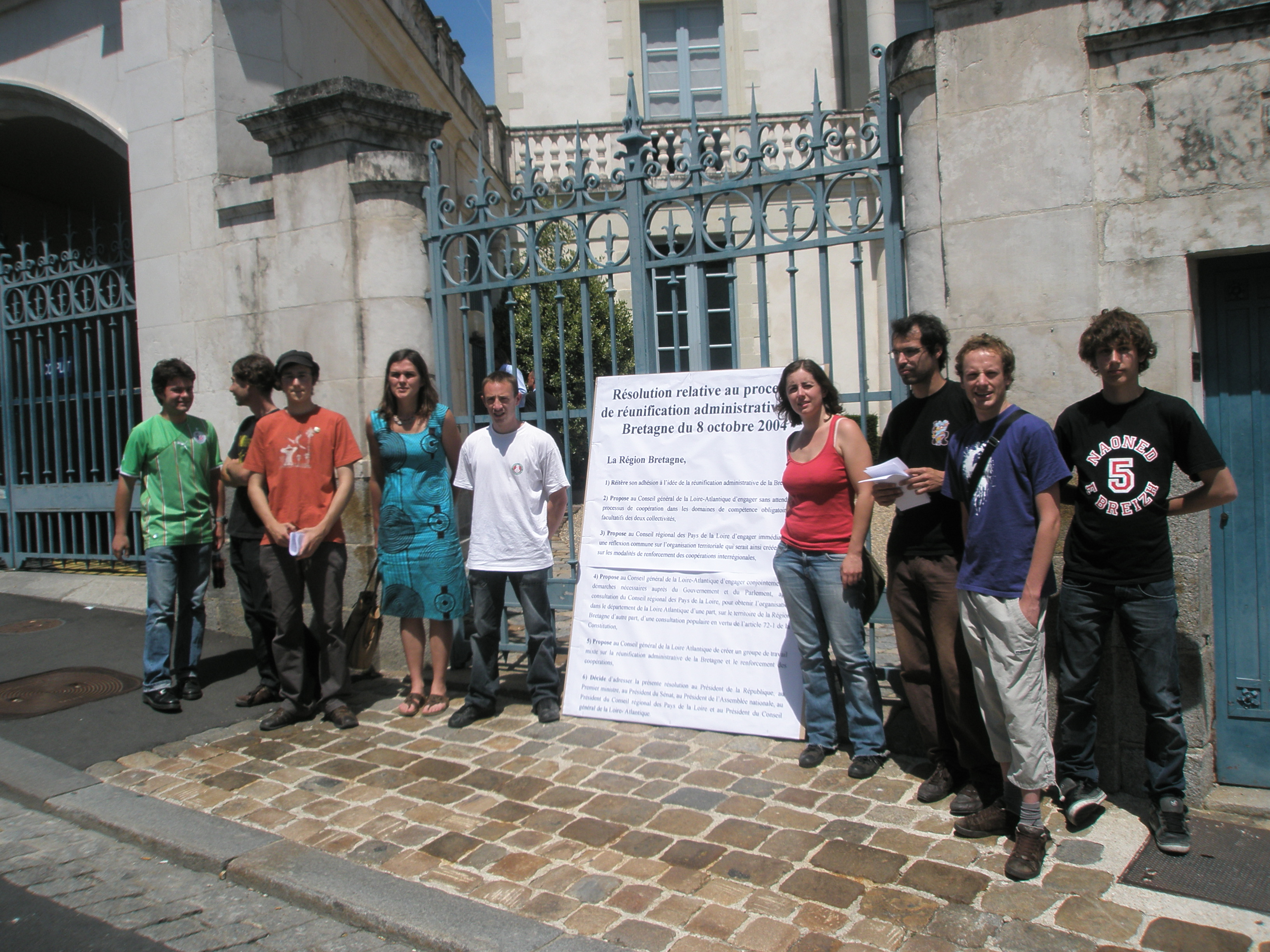 Vendredi 25 juin, une motion en faveur de la réunification de la Bretagne a été votée à l’unanimité au conseil régional de Bretagne. Des membres et des sympathisants du collectif 44=Breizh se sont rassemblés en début d’après-midi devant l’hémicycle du conseil régional pour faire passer une message aux élus : A plusieurs reprises, le conseil régional a pris position en faveur de la réunification, la résolution de 2004 notamment, constituait une promesse d’engagements importants pour avancer vers la réunification. Aujourd’hui encore, une motion est votée an conseil régional, néanmoins nous constatons que nous sommes toujours dans une situation de blocage démocratique (Lire le communiqué : https://44breizh.com/2010/06/21/44breizh-rencontre-des-elus-du-cr-bretagne-2/)