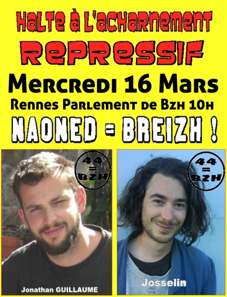 Nous appelons le plus grand nombre à venir les soutenir, devant le Parlement de Bretagne à Rennes le mercredi 16 mars à partir de 10h. Quelques mois avant le grand rendez-vous du 18 juin à Nantes, nous devons clairement afficher notre solidarité et venir soutenir Josselin et Jonathan.