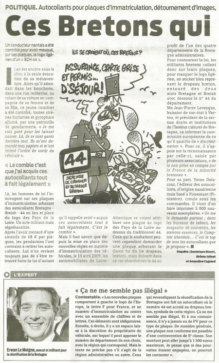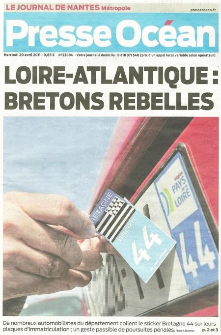 dont a été victime un habitant du Pays Nantais pour nous offrir une première page titrée « LOIRE-ATLANTIQUE : BRETONS REBELLES ». Cette personne avait choisi de recouvrir l’inscription Pays de la Loire de sa plaque d’immatriculation par un autocollant semblable à ceux de Bretagne administrative mais adapté au 44, comme ceux que nous distribuons gratuitement depuis maintenant deux ans. La gendarmerie à exercé une pression démesurée sur l’automobiliste pour lui faire retirer cet autocollant, comme si nous étions encore au temps où l’autocollant « BZH » était banni de nos voitures. Un comportement ridicule et volontairement discriminatoire, quand on sait qu’une bonne part de la société civile, mais aussi d’élus, s’étaient mobilisé au moment où le logo Pays de la Loire a été imposé sur les plaques des habitants du 44. Le collectif “plaques bretonnes 44” monté suite à cet événement et regroupant plusieurs associations et organisations politiques, dont 44=BREIZH, a à ce jour distribué plus de 70 000 autocollants de plaques 44 – BRETAGNE/BREIZH sur les 100.000 imprimés ! Depuis deux ans, notre collectif assure d’ailleurs une mission quasi publique de distribution gratuite — par courrier — d’autocollants de plaques à ceux qui nous en font la demande par internet. Nous en avons à ce jour envoyé près de 9000. À aucun moment la police n’est venu nous reprocher cette activité, pourquoi criminaliser et stigmatiser des conducteurs ? Nous invitons tous les habitants à la désobéissance et à ne pas céder aux gendarmes ou aux policiers trop zélés. Commandez et posez des autocollants 44 – BREIZH sur vos plaques, désobéissez à ceux qui veulent effacer notre revendication du débat public et citoyen. Le collectif, mais aussi l’association Skoazell Vreizh, sont là pour répondre et soutenir ceux qui refusent qu’on leur impose l’image d’habitant des « Pays de la Loire ».