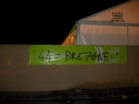 Début Août, la 20ème édition des Escales a ramené plus de 40 000 personnes, pour ce festival de musiques du monde. Évidemment, la région PdL était chez elle dans la municipalité de son collaborateur Joel Batteux. Le site et les programmes étaient blindés de pub et propagande PdL en tout genre, jusque sur l’écran géant de la grande scène ! Une dissonance qui contrairement à la musique n’adoucira pas les mœurs : la totalité des banderoles PdL, une quarantaine, auront été tagué de slogans « 44=BZH ». Pas la peine de se demander si la région finance l’événement pour soutenir la culture, ou par opportunisme pour poursuivre la création de son identité factice.