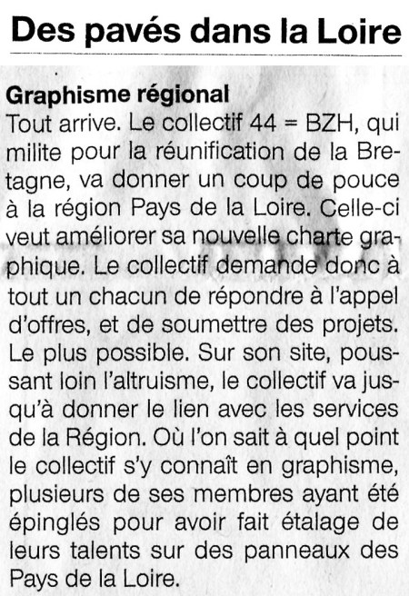 Article paru dans Ouest-France aujourd’hui suite au concours lancé par 44=BREIZH concernant la nouvelle charte graphique des Pays de la Loire… 😉