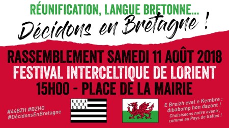 Nous souhaitons profiter du grand rendez-vous culturel international qu’est le Festival Interceltique de Lorient pour attirer l’attention sur l’absence totale de souveraineté décisionnelle en Bretagne. Nous souhaitons affirmer que le peuple breton doit être consulté sur le périmètre de son pays et sur les compétences qu’il pourrait lui-même exercer, notamment en matière linguistique… Car comme le montre la mobilisation des écoles Diwan pour avoir un vrai statut public local ou le refus de l’État civil français d’orthographier correctement nos prénoms ou celui de nous laisser passer notre bac ou notre brevet en breton, la lutte reste notre seule perspective.