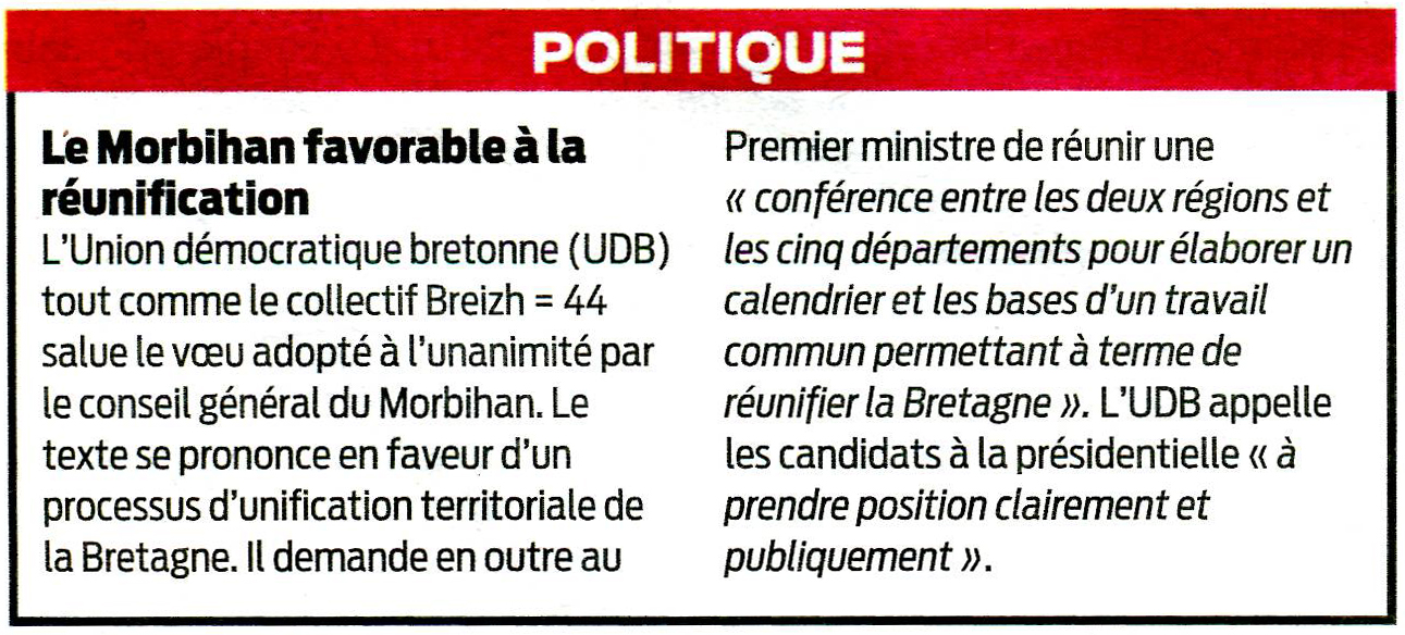 L’Union démocratique bretonne (UDB) tout comme le collectif 44=Breizh salue le vœu adopte à l’unanimité par le conseil général du Morbihan. Le texte se prononce en faveur d’un processus d’unification territoriale de la Bretagne. Il demande en outre au Premier ministre de réunir une «conférence entre les deux régions et les cinq départements pour élaborer un calendrier et les bases d’un travail commun permettant à terme de réunifier la Bretagne». L’UDB appelle les candidats a la présidentielle «à prendre position clairement et publiquement».