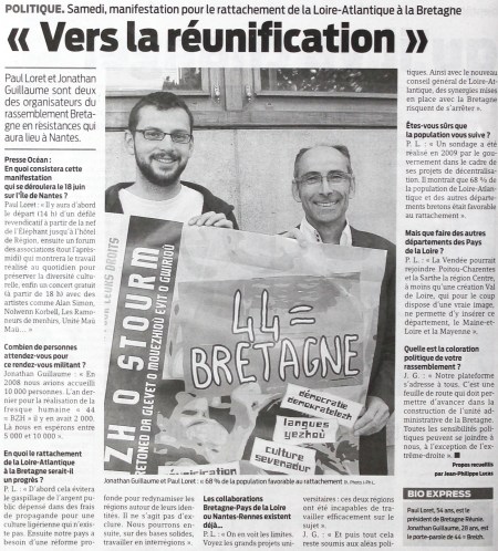 La réponse faite par le président du Conseil Général de Loire-Atlantique, affirmant être «ni pour ni contre» la réunification et insistant sur le fait de «privilégier une nouvelle étape de la décentralisation avant la question du découpage régional» n’est clairement pas celle que nous attendons. Où sont passés les engagements du Conseil Général de Loire-Atlantique ? La question territoriale doit être réglée en même temps que celle du statut d’une nouvelle collectivité bretonne, si l’on ne veut creuser le sentiment d’injustice et l’attente existant en Loire-Atlantique.
